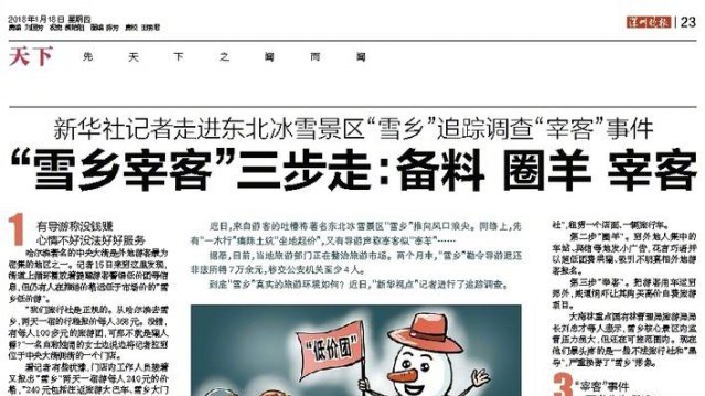 " 雪乡宰客 " 三步走:备料 圈羊 宰客近日,来自游客的吐槽将著名东北冰雪景区 " 雪乡 " 推向风口浪尖。网络上,先有 " 一木行 " 痛陈土炕 " 坐地起价 ",又有导游声称宰客似 " 宰羊 "……据悉,目前,当地旅游部门正在整治旅游市场。两个月中," 雪乡 " 勒令导游退还非法所得7万余...