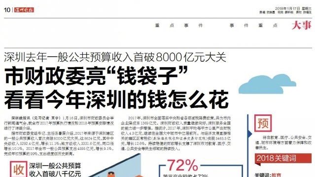 2017 年来源于深圳辖区的一般公共预算收入首次突破 8000 亿元大关。2018 年将在教育、医疗、公共安全、交通、城市环境等方面着力保障和改善民生。深圳晚报讯(见习记者 王宇)1 月 16 日,深圳市财政委员会举行新闻通气会,就全市 2017 年预算执行情况和 2018 年预算安排情况进行了...