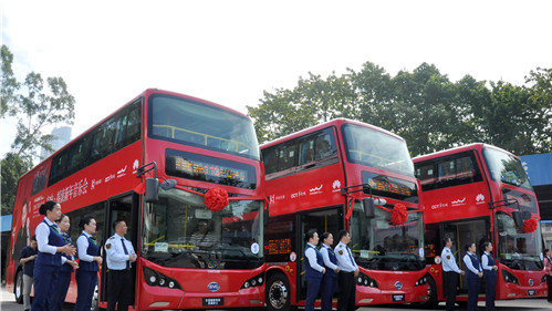 12 月 5 日,"国内首批比亚迪纯电动双层大巴投放仪式"在深圳市莲花山公交总站举行。作为世界首款一级踏步纯电动双层大巴,K8S 继去年 10 月在英国伦敦亮相后,今年在国内首次发布,并迎来了首批车辆投放深圳巴士集团运营。未来深圳将有 30 台比亚迪纯电动双层大巴投入旅游观光线路,打造"艺术、...