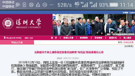 近日网传深大食堂检出地沟油,市食药局于第一时间核查并抽检,抽检结果将于3日内公布。